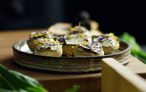 Заправьте грибы приготовленным соусом, посыпьте сверху небольшим количеством гречки и нарезанных трюфелей и завершите сушеными съедобными цветами.