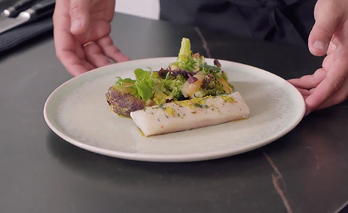 Подача: Треску подаем вместе овощами c соусом Беарнез и щучьей икрой