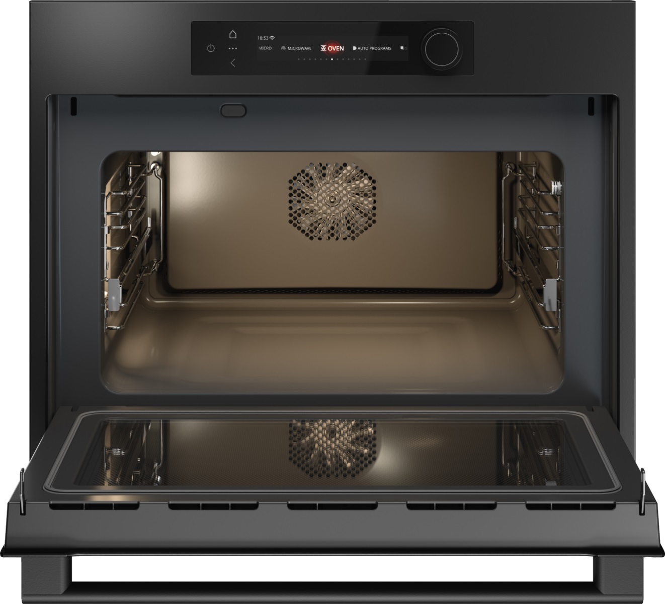 Тип дисплея: 6-дюймовый полноцветный сенсорный TFT-дисплей и многофункциональный поворотный переключатель, со световым кольцом-индикатором, для лёгкого доступа к функциям духового шкафа и обзора состояния приготовления пищи.