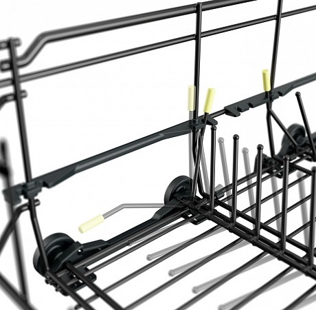 • Нижняя корзина Exclusive: Раздвижные и складные держатели для тарелок в заднем ряду, складные держатели для тарелок в переднем ряду, держатель для ваз и бутылок.