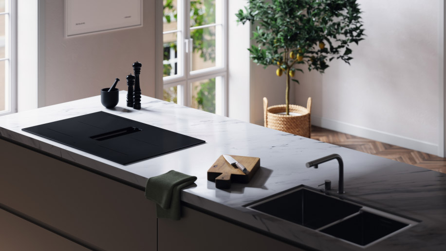 По умолчанию вытяжка автоматически поднимается при работе индукционной варочной панели. В поднятом положении вытяжка улавливает пары более эффективно особенно если вы готовите в высокой посуде.